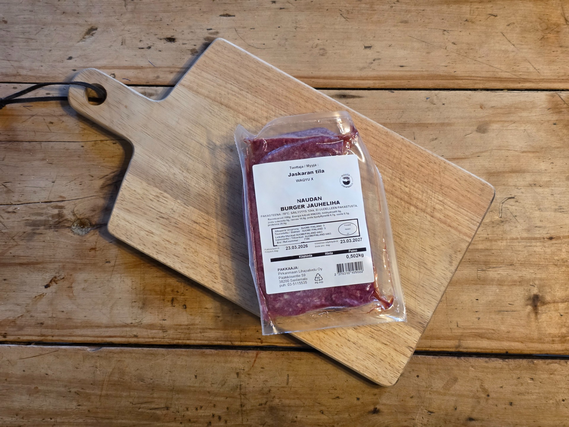 Erä Jaskaran tilalla kasvanutta waqyuX -rotuista härkää burgerjauhelihan muodossa. Rasvaa tässä jauhelihassa on n.20%.